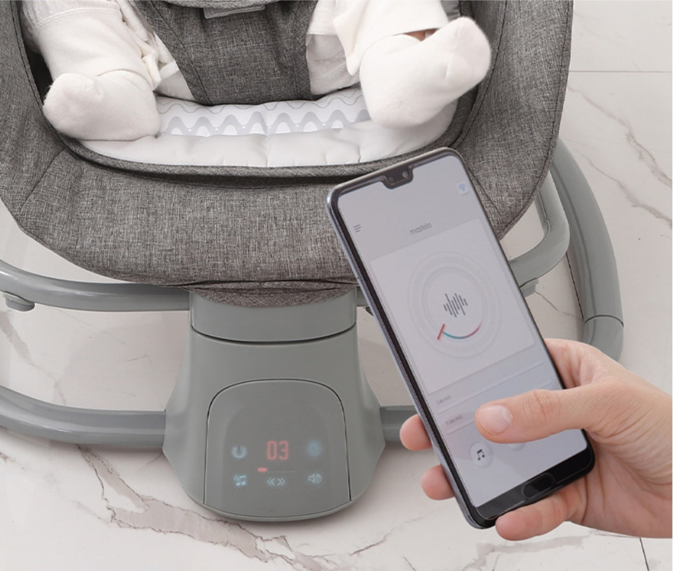 Choose from 5 gentle swing angles with timer options (15, 30, 45, or default 60 minutes). Control soothing melodies and motion easily via the gentle-touch control panel.